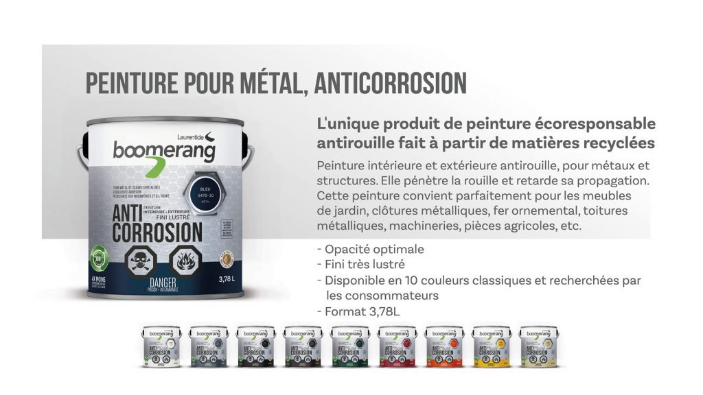 La peinture Boomerang pour métal est le fruit d’efforts soutenus déployés par l’équipe de R&D de Société Laurentide afin de répondre à un besoin manifesté chez les consommateurs : concevoir un produit à faible impact environnemental dans la gamme de peinture anticorrosion destinée aux particuliers.